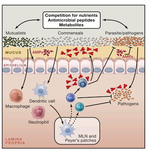 Figure 3. Promotion of Protective Immunity by the Microbiota The symbiosis between the microbiota and its mammalian host encompasses multiple relationships, including mutualistic, parasitic, and commensal. The capacity of a given microbe, including those composing the microbiota, to trigger or promote disease is highly contextual, and some microbes can shift from mutualist to commensal to parasite according to the state of activation of the host, co-infection, or localization. Commensals can control microbes with pathogenic potential (as normal constituent of the microbiota or acquired) via distinct mechanisms. Commensals can compete for nutrients and produce antimicrobial molecules and metabolites that affect the survival and virulence of pathogens. Commensals can promote the production of antimicrobial peptides by epithelial cells and reinforce tight junctions. Finally, commensals can modulate the function of dendritic cells and other innate cells both locally and systemically in a manner that promotes the induction of effector T and B cells responses against pathogens. When uncontrolled, this adjuvant property of the microbiota can promote inflammatory and autoimmune disorders.