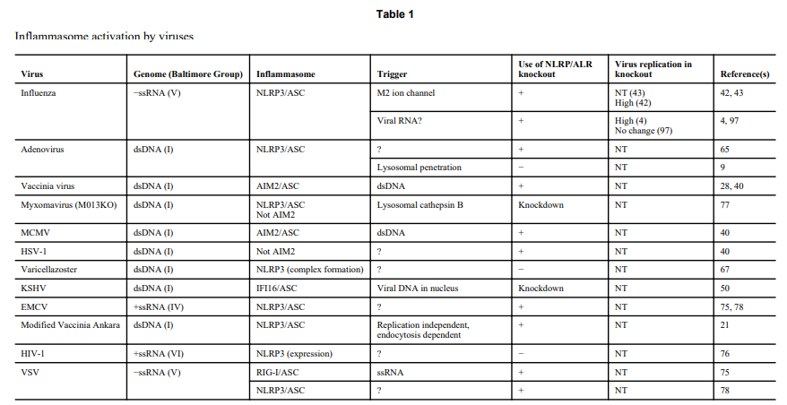 Most viral infections impose by necessity some form of membrane stress or damage during entry, fusion, replication, and budding. Not surprisingly, emerging evidence indicates that host cells sense viral infections through NLRP3 and other innate sensors (Table 1). Table 1 summarizes the current evidence for how each of these viruses activates the inflammasome; in many cases neither the trigger for activation nor the antiviral relevance of inflammasomes is known. One exception is influenza virus, for which we understand the molecular trigger and the immune consequences of inflammasome activation.